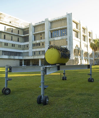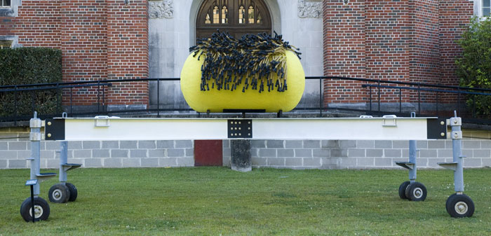 1) Nuclear explosion July 16, 1945 The centerpiece of the sculpture is a large yellow tank reminiscent of the shape of the first nuclear device exploded at the Alamogordo test site in New Mexico. The title of this test was "Trinity".